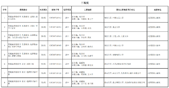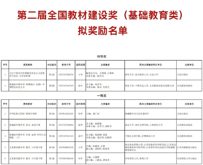 根据国家教材委员会关于开展第二届全国教材建设奖评选工作的部署安排,经出版单位申报、地方初评推荐、国家初审、地方公示、国家复审等程序,拟奖励全国优秀教材989种(基础教育类192种、职业教育与继续教育类400种、高等教育类397种)。