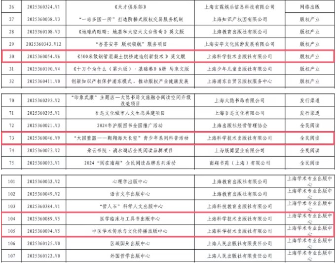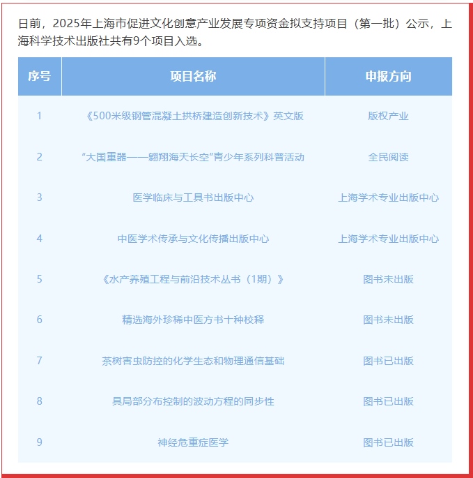 日前,2025年上海市促进文化创意产业发展专项资金拟支持项目(第一批)公示,上海科学技术出版社共有9个项目入选。