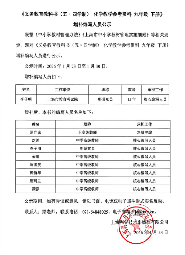 义务教育教科书 化学教学参考资料 九年级 下册 增补编写人员公示